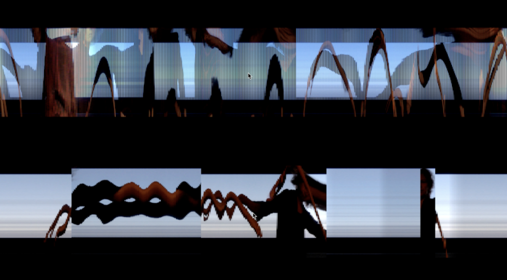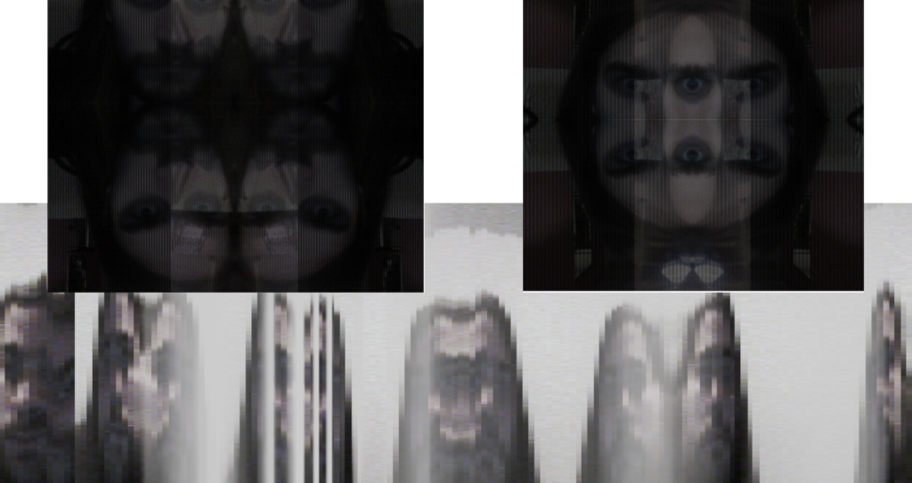 We translated the double slit experiment into a setup using video slit scanning. We experimented with several video slit scanning techniques, as shown on the footage below. Three screens were placed in a triangle, were an observer could stand in between. Each screen used a different slit scanning technique. One could look at one the the screens, see the other two scans recorded in the back, and thus look in a mirror causing interference patterns in the mind of the observer.